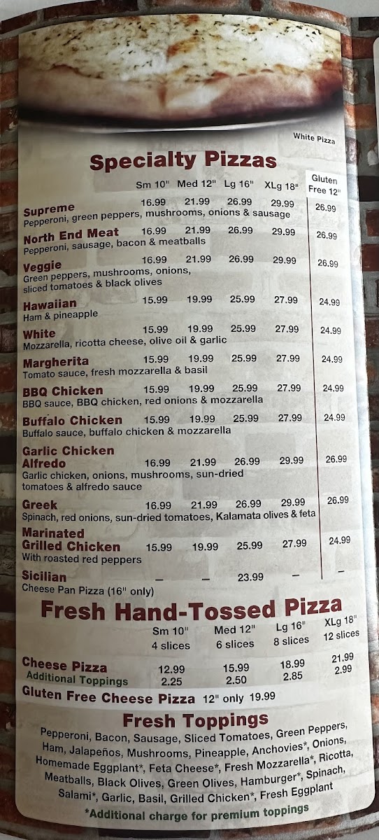The menu at North End Pizza is a treasure trove of delicious options, featuring everything from classic cheese slices to inventive specialty pies. One standout is the Buffalo Chicken Pizza, praised by customers for its perfect level of spice—a favorite for families seeking both comfort and excitement in their meal. If you’re feeling adventurous, don’t miss the chance to try their Hawaiian pizza—a delightful fusion of sweet and savory that has captivated many taste buds. For those who enjoy munching before the main event, the 10 Chicken Wings ($20.24) and 6 Fresh Garlic Knots ($8.76) make for perfect starters, ensuring your cravings are well taken care of even before the first slice is served.
